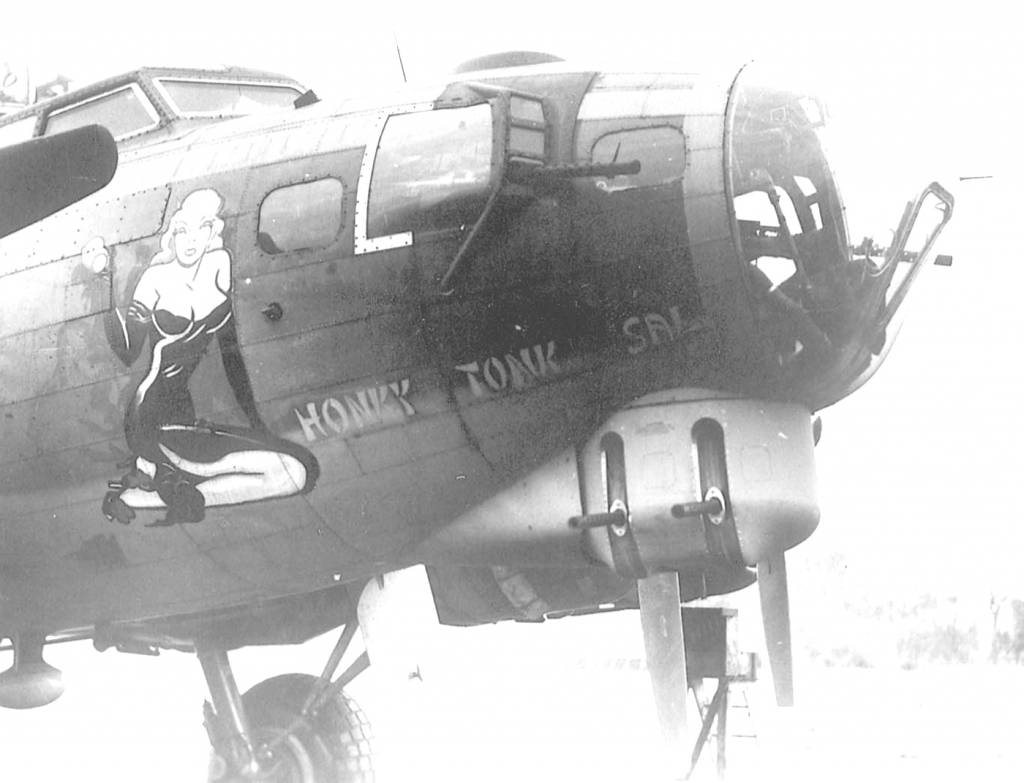 Delivered Cheyenne 22/10/43; Grand Island 30/10/43; Wilmington 13/11/43; Assigned: 548BS/385BG [GX-X] Gt Ashfield 19/11/43; slight mid-air collision with ' Pilot: Chas McCauley crash-landed five miles E of Cambridge, UK 12/5/45; Salvaged. 15/3/45. HONKY TONK GAL.