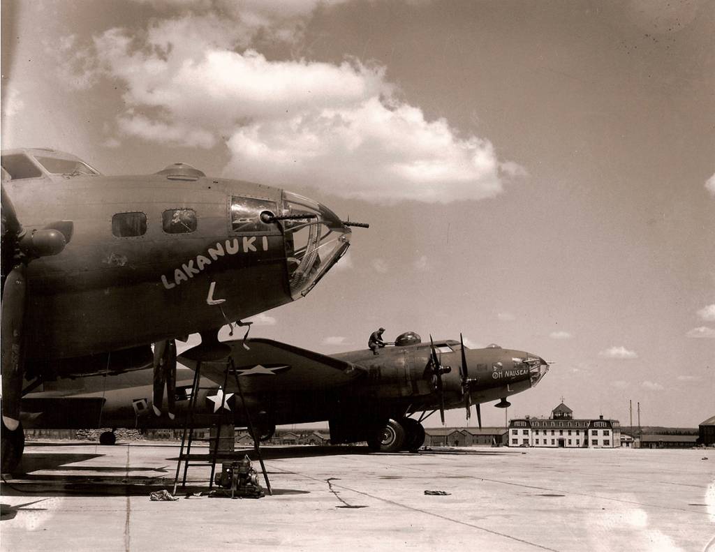 Delivered Cheyenne 7/4/43; Assigned 100BG Dow Fd 23/5/43; transferred 545BS/384BG [JD-T] Grafton Underwood 23/6/43; Missing in Action Le Mans 4/7/43 with Larry Meyer, Co-pilot: Norman Gauntt, Navigator: Jim Crouch, Bombardier: Tom Brzoznowski, Flight engineer/top turret gunner: Jim LaRue, Radio Operator: Jack Davidson, Ball turret gunner: Jim Carter, Waist gunner: Floyd Hubble, Waist gunner: Ken Christensen (9 Killed in Action);Tail gunner: Dave Butcher (evaded capture); enemy aircraft, crashed Pipriac, SW of Laval, Fr. Missing Air Crew Report 3035/4495. LAKANUKI.