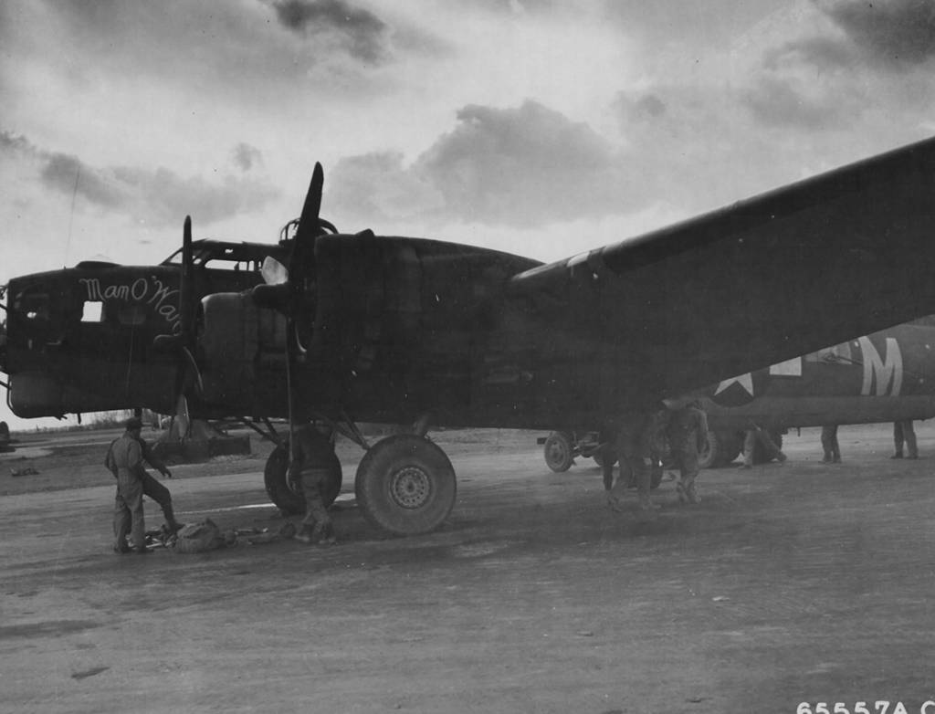 Delivered Cheyenne 19/11/43; Grand Island 15/12/43; Presque Is 21/12/43; Assigned 612BS/401BG [SC-M] Deenethorpe 6/1/44; Missing in Action Frankfurt 20/3/44 with John Dunaway, Co-pilot: Henry Kane, Radio Operator: Francis Mastronardi, Ball turret gunner: Walter Rusch (4 Prisoner of War); Bombardier: Theo Krol, Waist gunner: John Katsaros (2 evaded capture); Navigator: Bill Mock chute failed, Flight engineer/top turret gunner: Harry Horst, Waist gunner: John Crowley,Tail gunner: Marvin Benz (4 Killed in Action); enemy aircraft, crashed near Brueil, 14 miles W of Rheims, Fr; Missing Air Crew Report 3332.