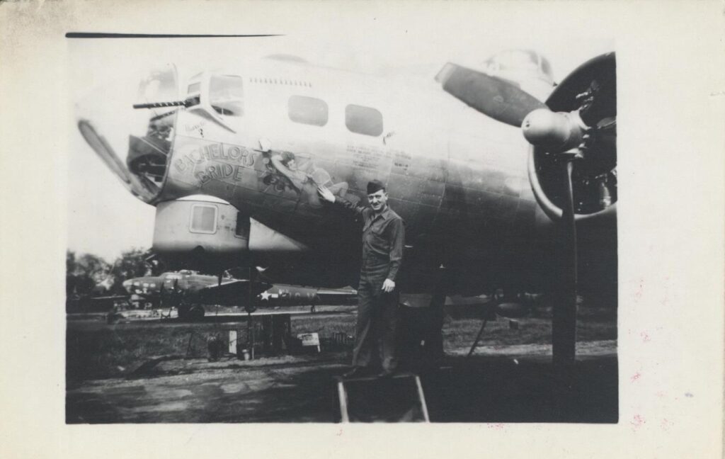 Delivered Cheyenne 16/2/44; Gr Island 2/3/44; Grenier 22/3/44; Assigned 322BS/91BG [LG-C] Bassingbourn 7/4/44; Missing in Action 3+m Toulouse 25/6/44 with Farrall Goodrich, Co-pilot: Stan Spencer, Navigator: John Smith, Bombardier: Harry Kurras, ttg-Bill Zura, Radio Operator: Jesse CragheadWounded in Action, Ball turret gunner: Bill FannWounded in Action, Waist gunner: Edwin Braun,Tail gunner: John Callaghan (9INT); flak KO’d #4 before enemy aircraft hit #2 & #3, force landed uphill in Spanish meadow, La Campa de Erandio, Sondico, ten miles NE of Bilbao, Spain; Missing Air Crew Report 6545. BACHELOR’S BRIDE.