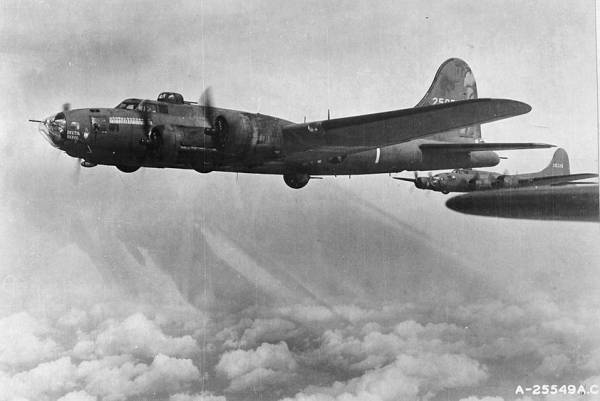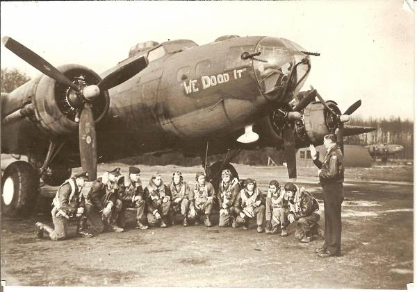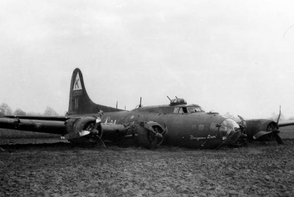 Delivered Cheyenne 11/9/43; North Platte 19/9/43; Assigned 545th Bomb Squadron, 384th Bomb Group [JD-L] Grafton Underwood 1/3/44; Missing in Action Schweinfurt 12 April 1944 with Max Jean Miller, Co-pilot: James E. Dent Jr., Navigator: Theophilius Edward Beinar, Flight engineer/top turret gunner: Elvie Lawrence Rodden, Radio Operator: Henry Overholt Watson, Ball turret gunner: Saul Jack Schelberg, Waist gunner: Howard Rucolph Leconey,Tail gunner: Albert Patrick Krizner (8 Killed in Action); Bombardier: Darrell Clark Getty [leg amputated in Eppenheim hospital, Waist gunner: Edwin Pierce Fulkerson (2 Prisoner of War); attacked head on by 15 enemy aircraft, crashed Elmhausen/Bergstrasse, nine miles S of Darrmstadt, Ger; Missing Air Crew Report 3866.