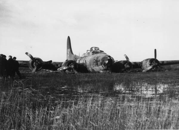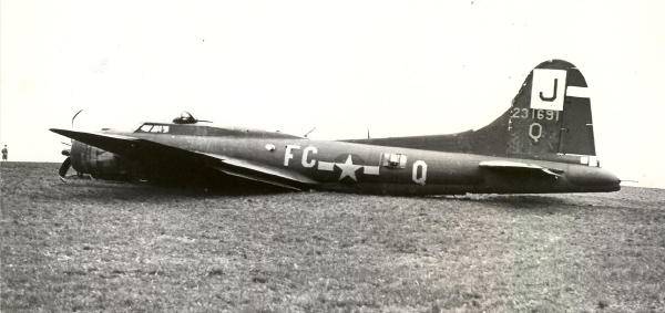 Delivered Long Beach 20/10/43; Assigned 366BS/305BG [KY-S] Chelveston 5/1/44. Crashed near Canterbury on return from mission to Saarbrucken on 11 May 1944. Two crew had bailed out over Germany and were captured. MACR 4874 Missing in Action Merkville 3/8/44 with Ben Buttrey, Co-pilot: Bob Heithoff, Navigator: Jim McDermott, Bombardier: Bob Horn, Flight engineer/top turret gunner: Edsel Newton, Radio Operator: Walt Crusoe, Ball turret gunner: Warren Dunphy, Waist gunner: Joe Quain,Tail gunner: Chas Newell (9 Prisoner of War); flak, crashed wood near Buhl, Baden-Baden, Ger; Missing Air Crew Report 7702. SWINGING DOOR aka V-FOR VICTORY.