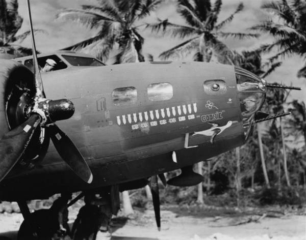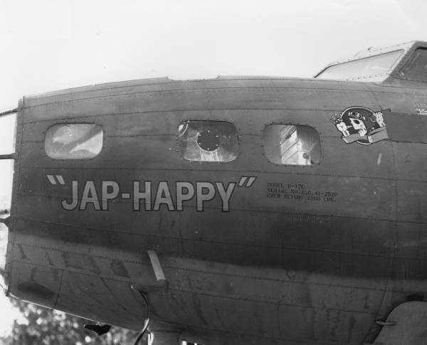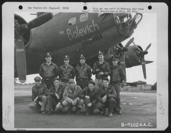 Delivered Tulsa 20/3/44; Kearney 3/4/44; Grenier 7/4/44; Assigned 601BS/398BG [3O-Z] Nuthampstead 5/5/44; repaired Missing in Action 21/11/44 with Lt Landrun but ret 24/11/44; declared WW 23/12/44 and became group’s weather ship; landing gear collapsed while taxying from non-op with David Mills 2/4/45; Salvaged 4/4/45.
