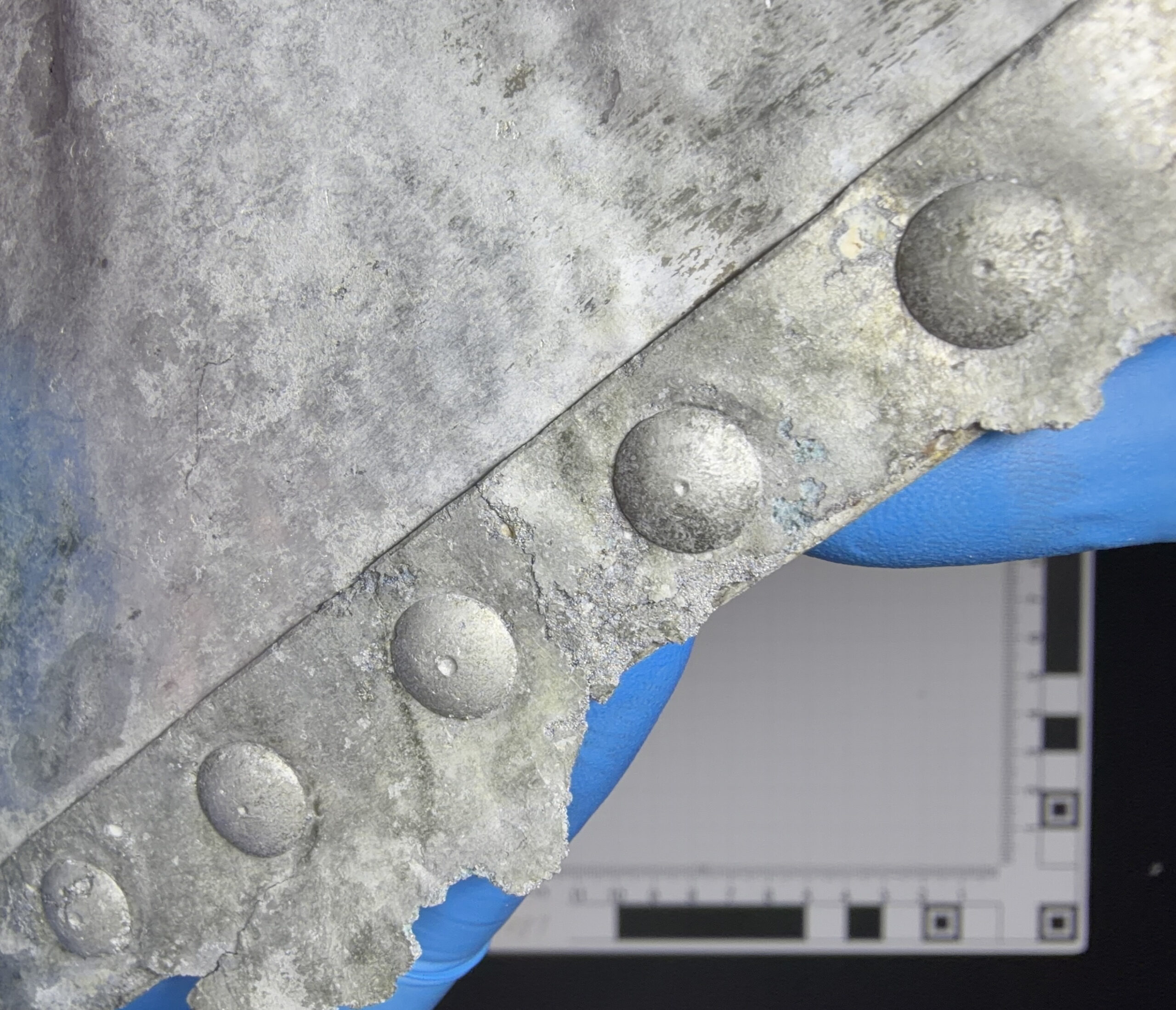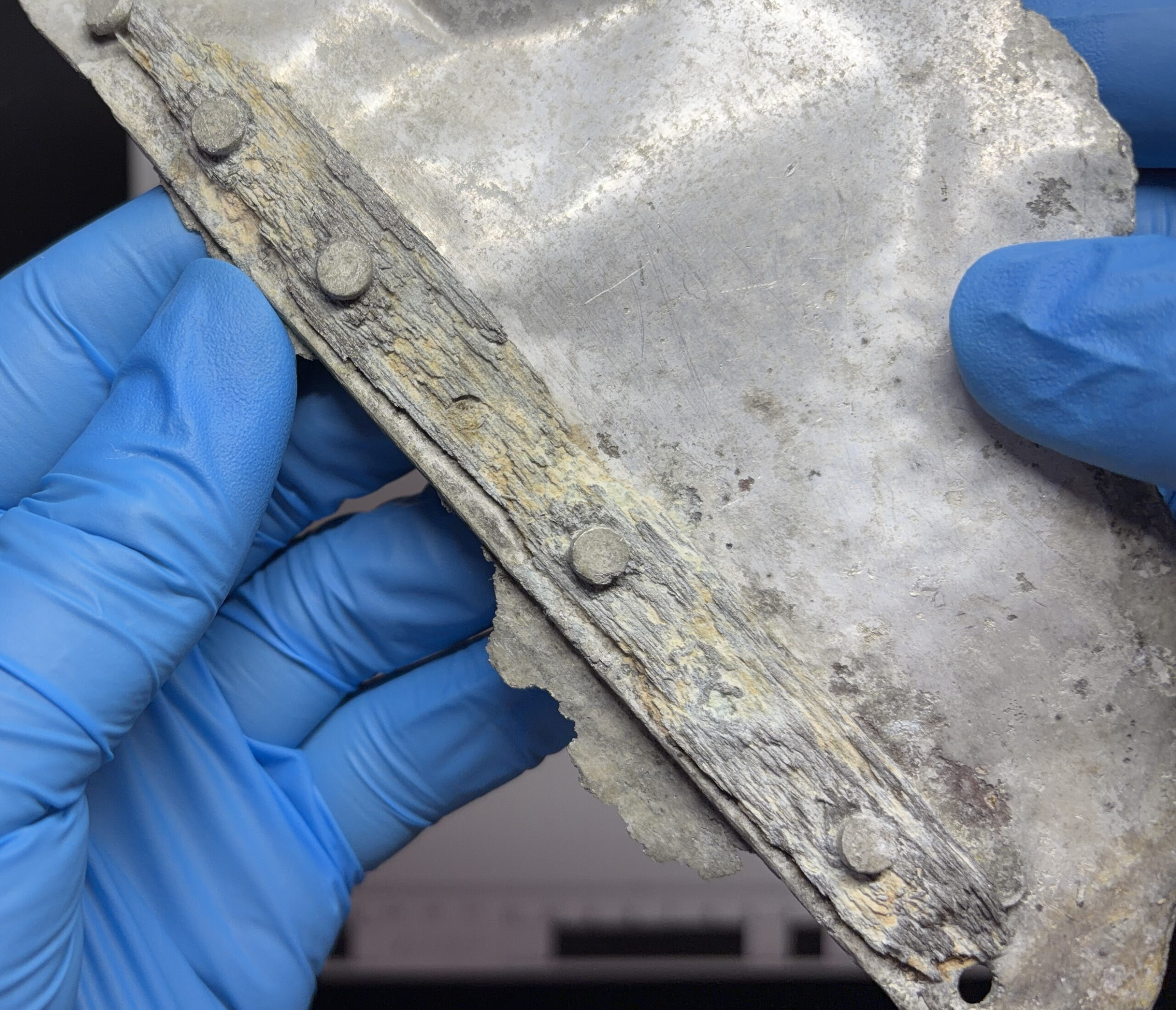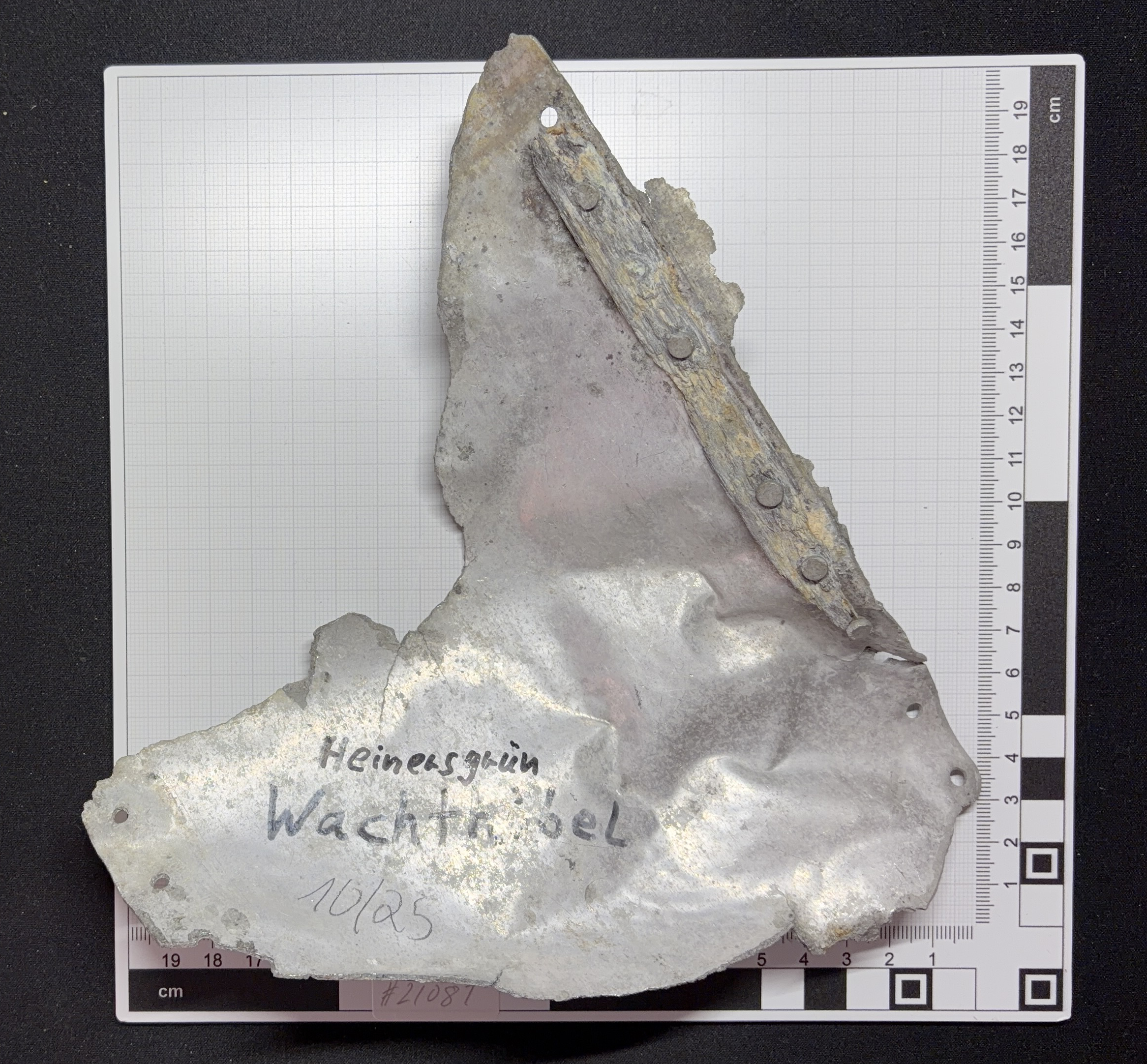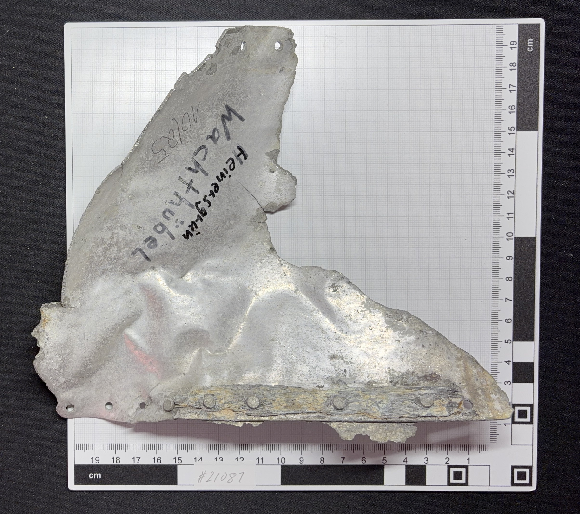 Aluminium-Teil. Keine Farbreste oder Lackierungen sichtbar. Ca. 1mm dick. Sichtbar sind auch 7 Nieten und 4 Löcher/Bohrungen, wo die Nieten fehlen.