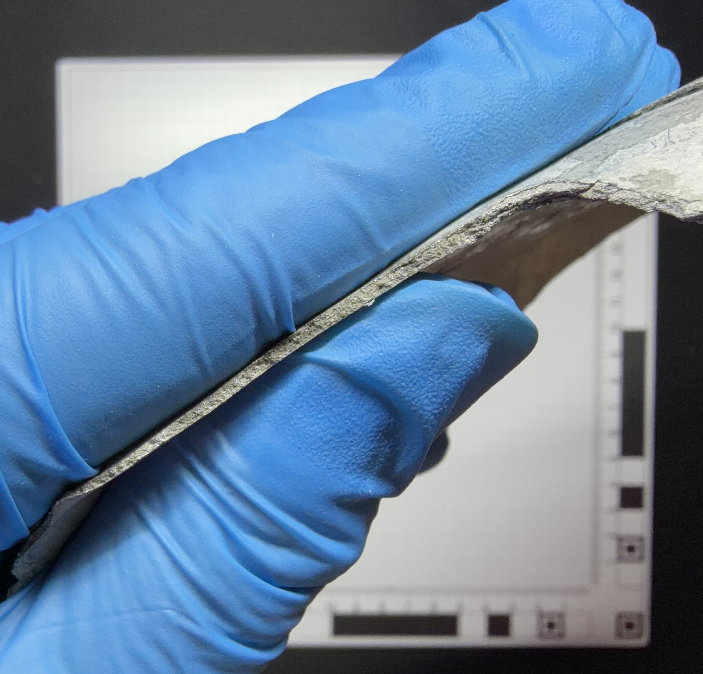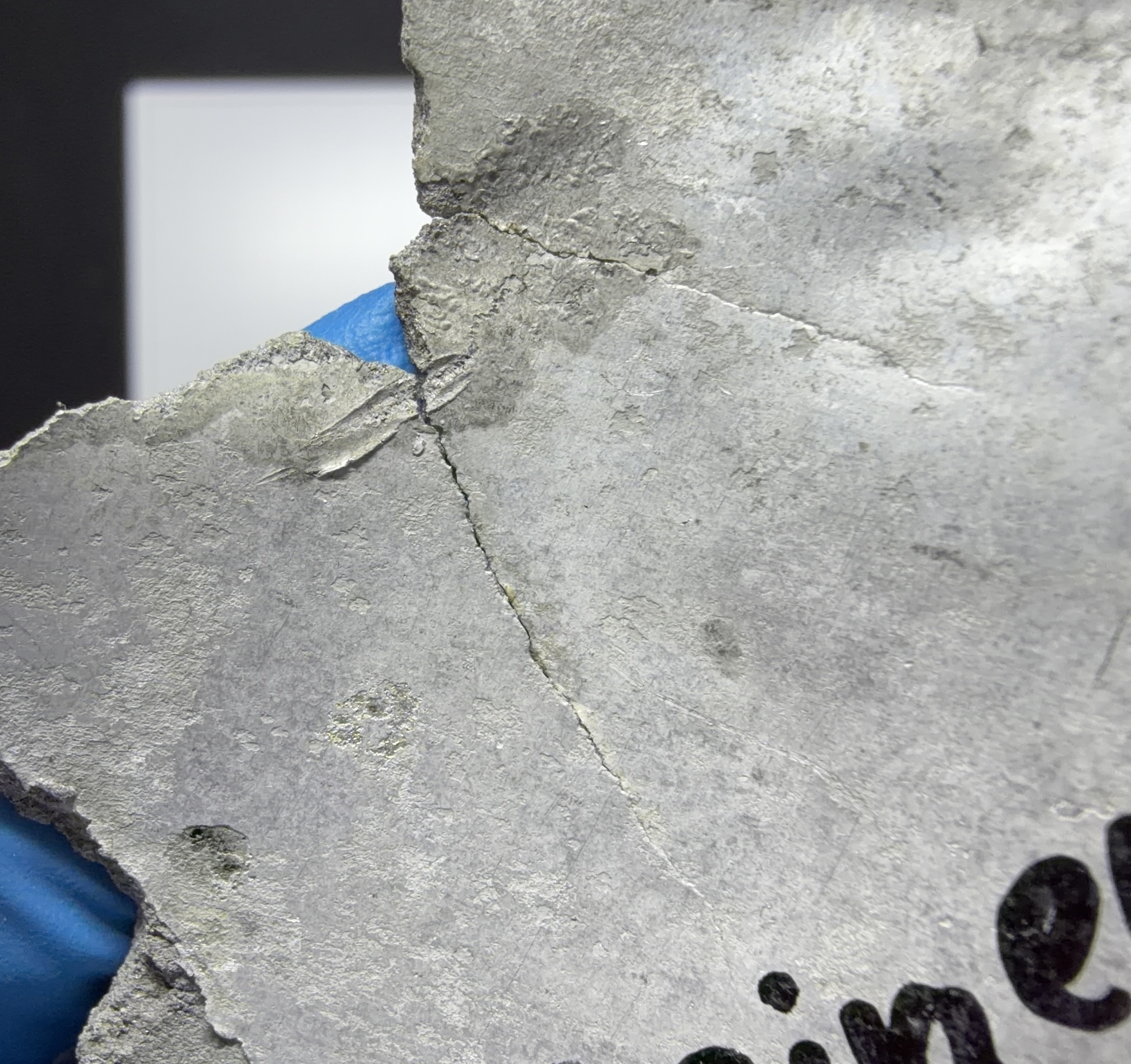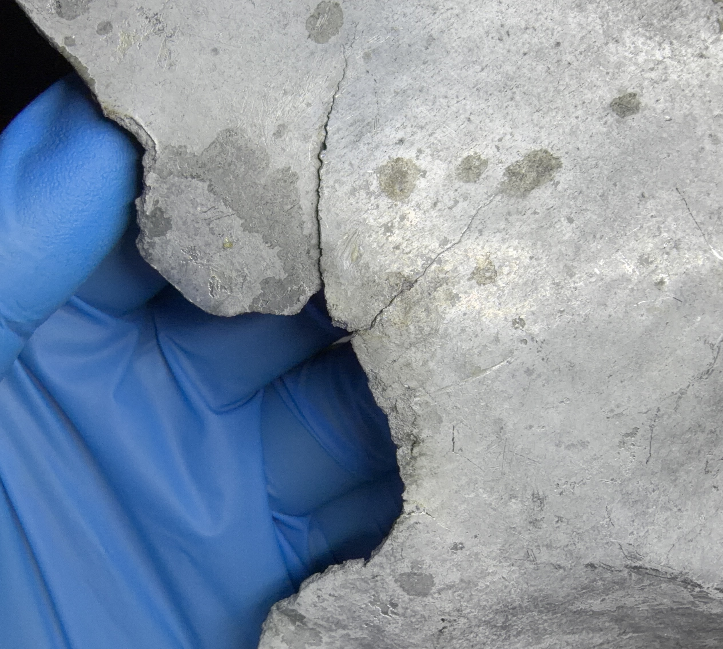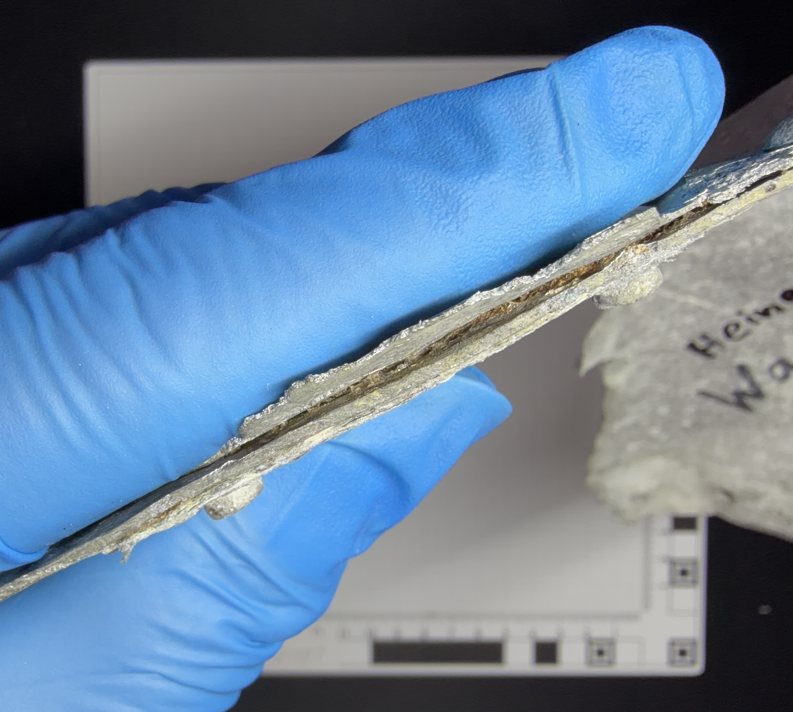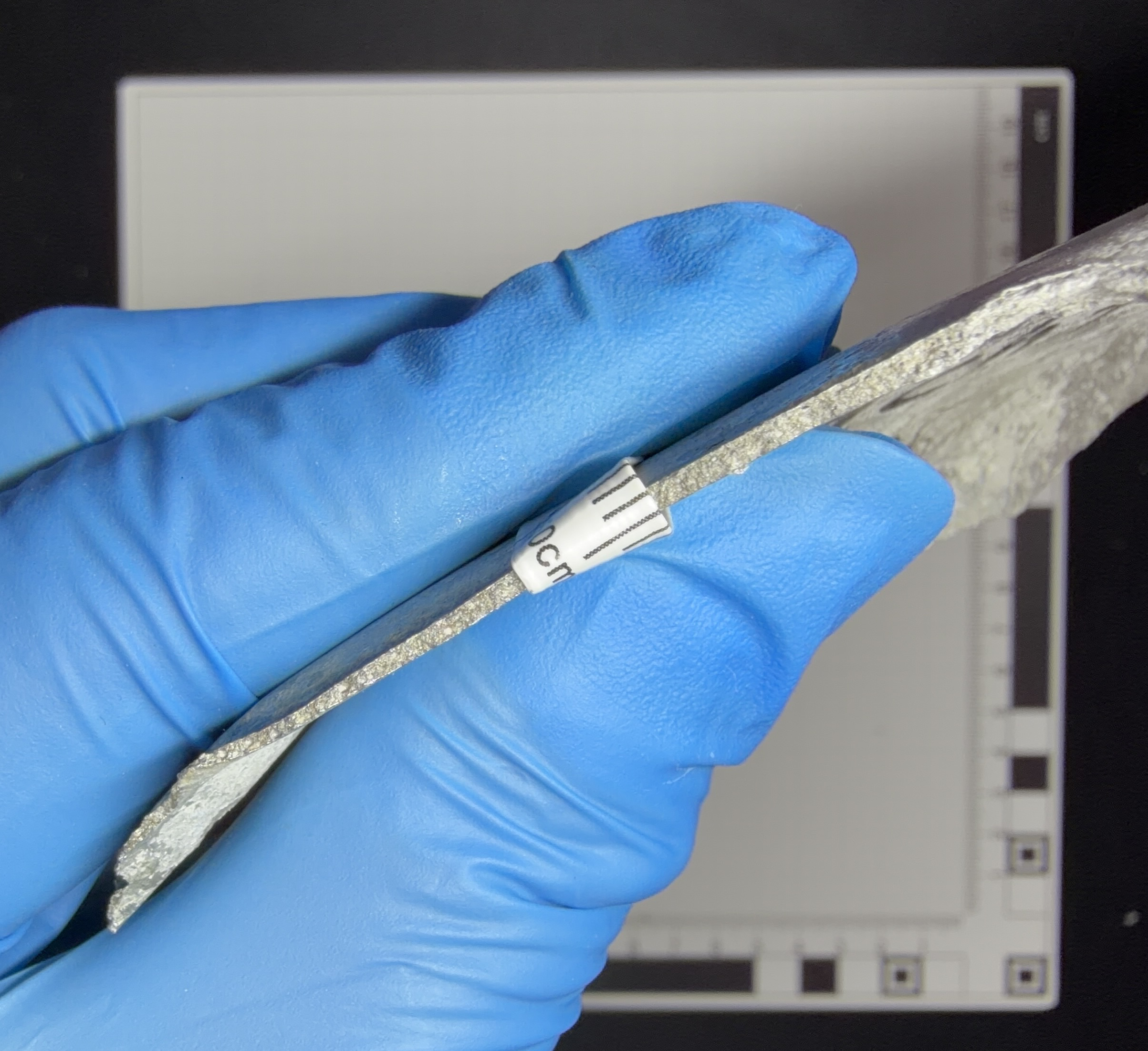 Aluminium-Teil. Keine Farbreste oder Lackierungen sichtbar. Ca. 1mm dick. Sichtbar sind auch 7 Nieten und 4 Löcher/Bohrungen, wo die Nieten fehlen.