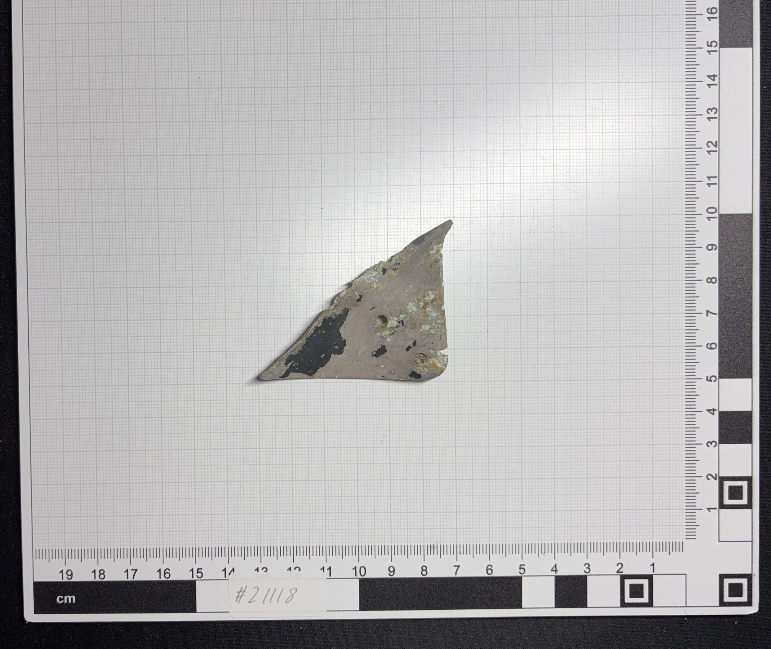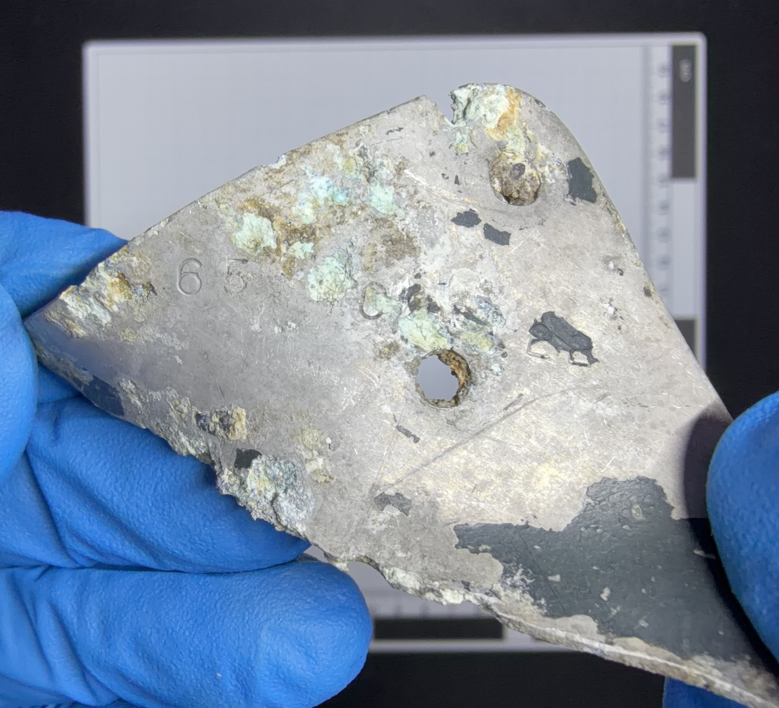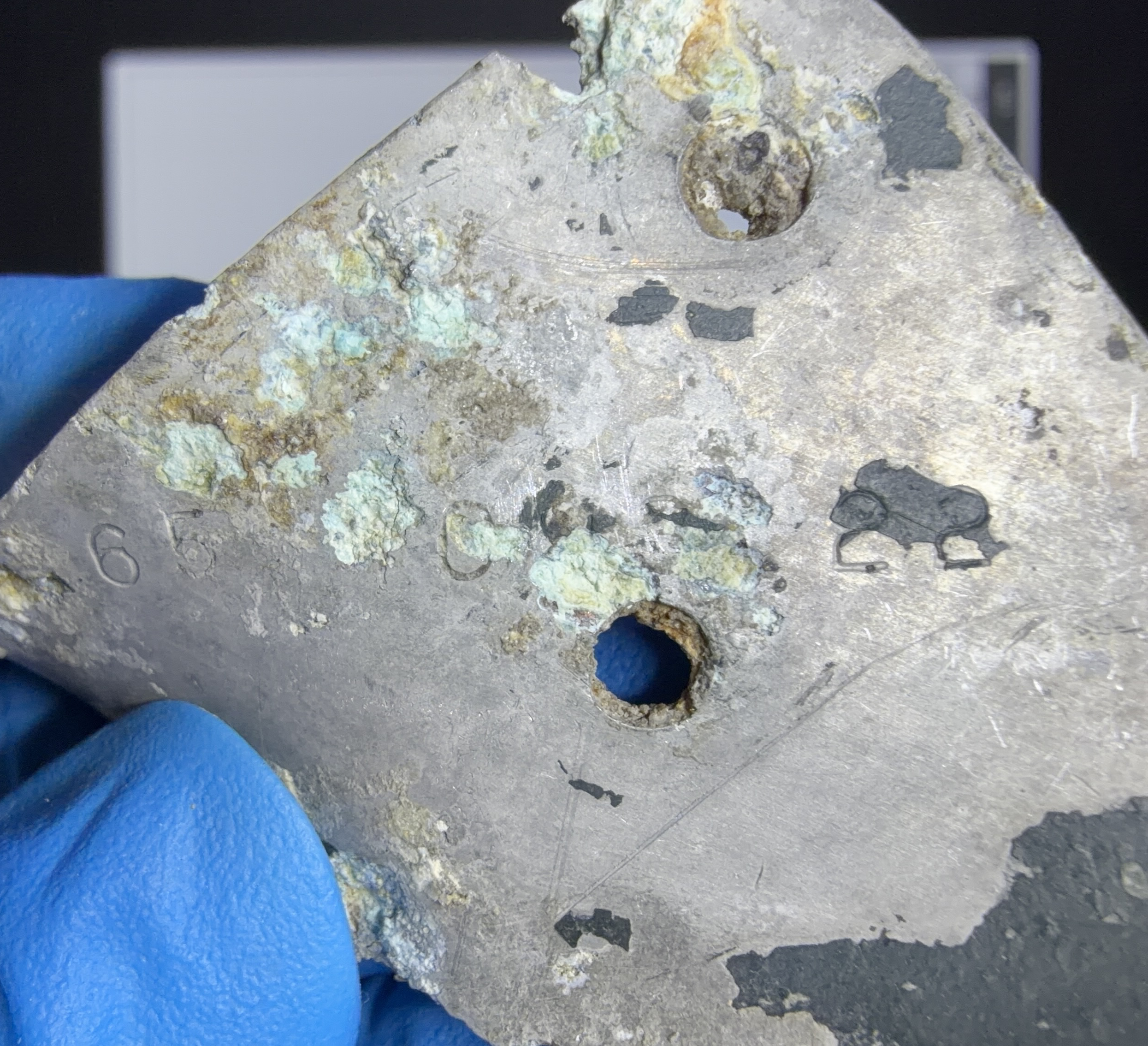 Ein Teil einer abgebrochenen U-Schiene (eng. Channel). Dieses Teil wurde am Untergestell (engl. Pilots Seat Support) des Pilotensitzes verbaut. |