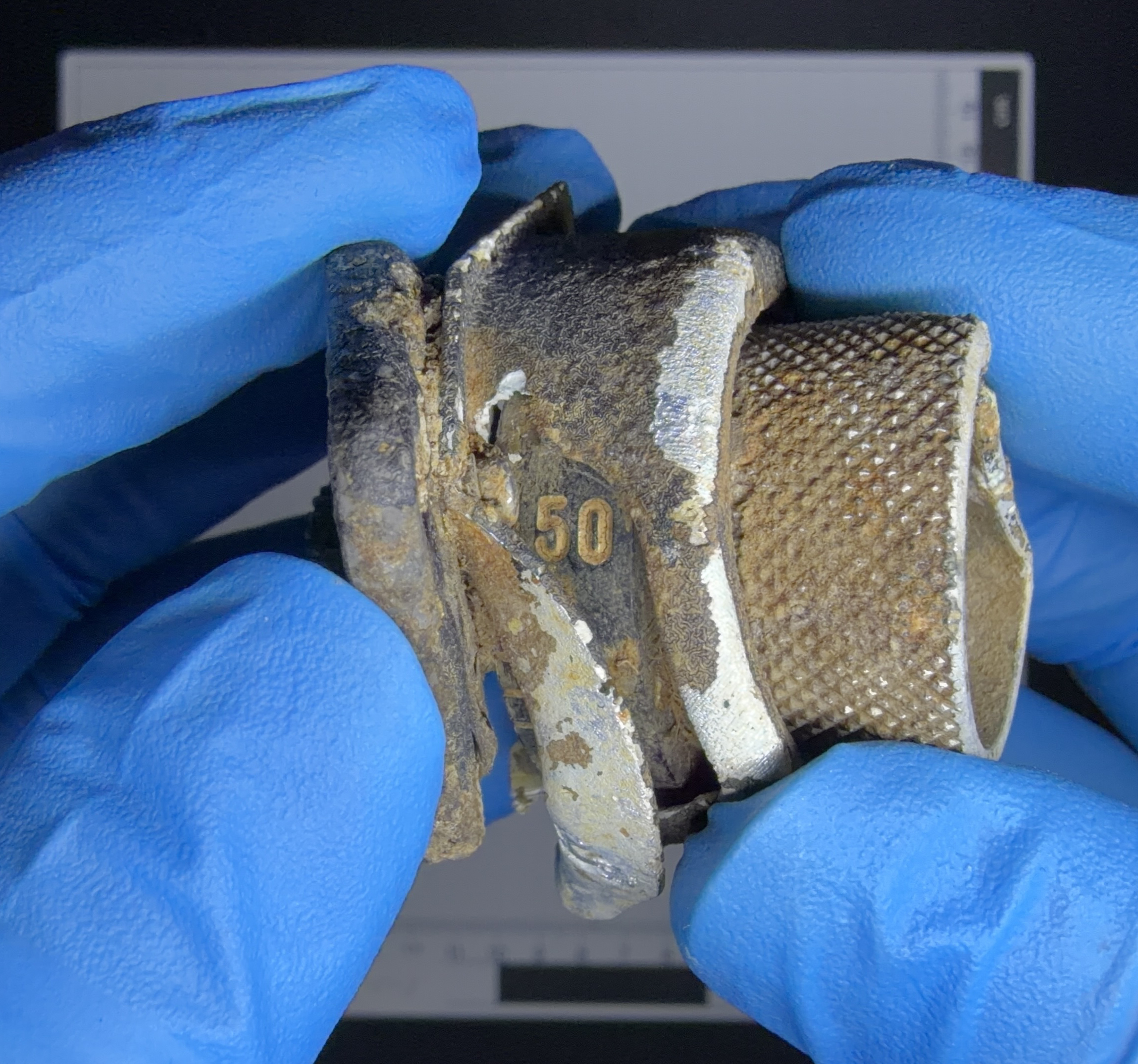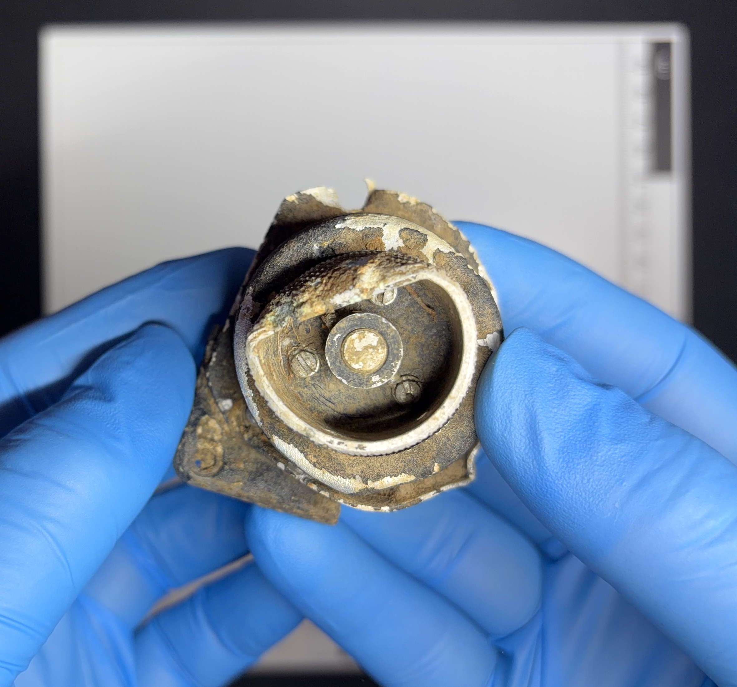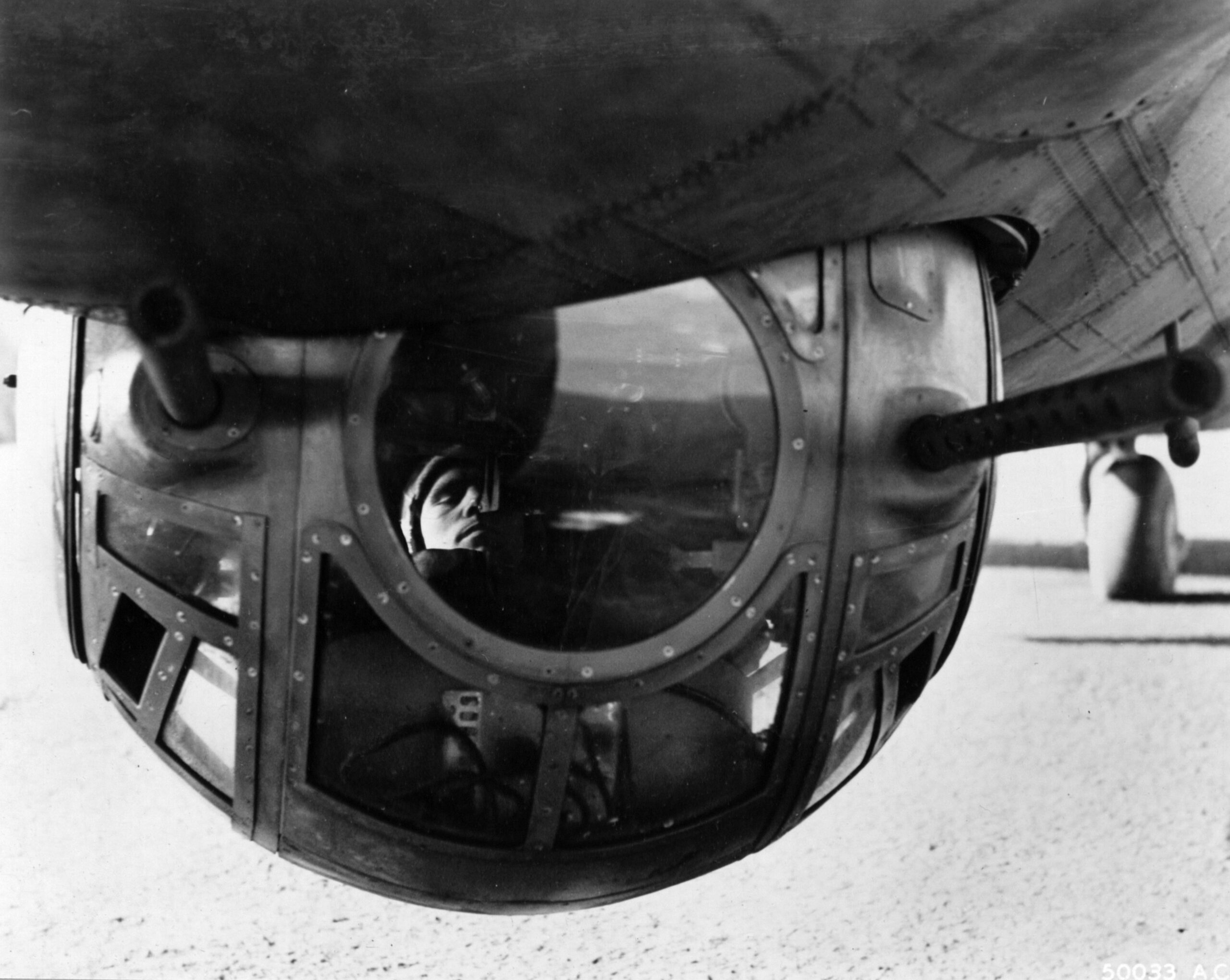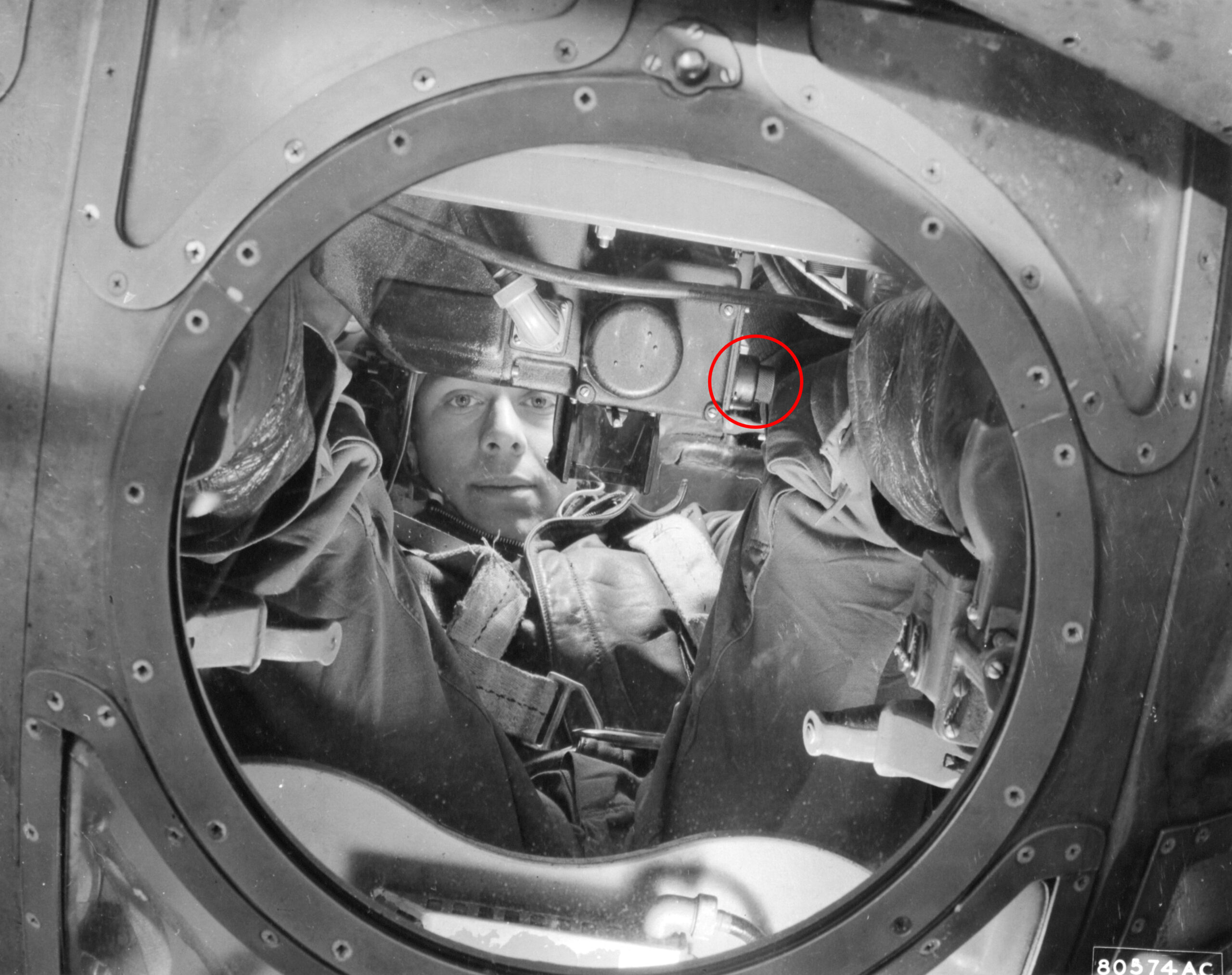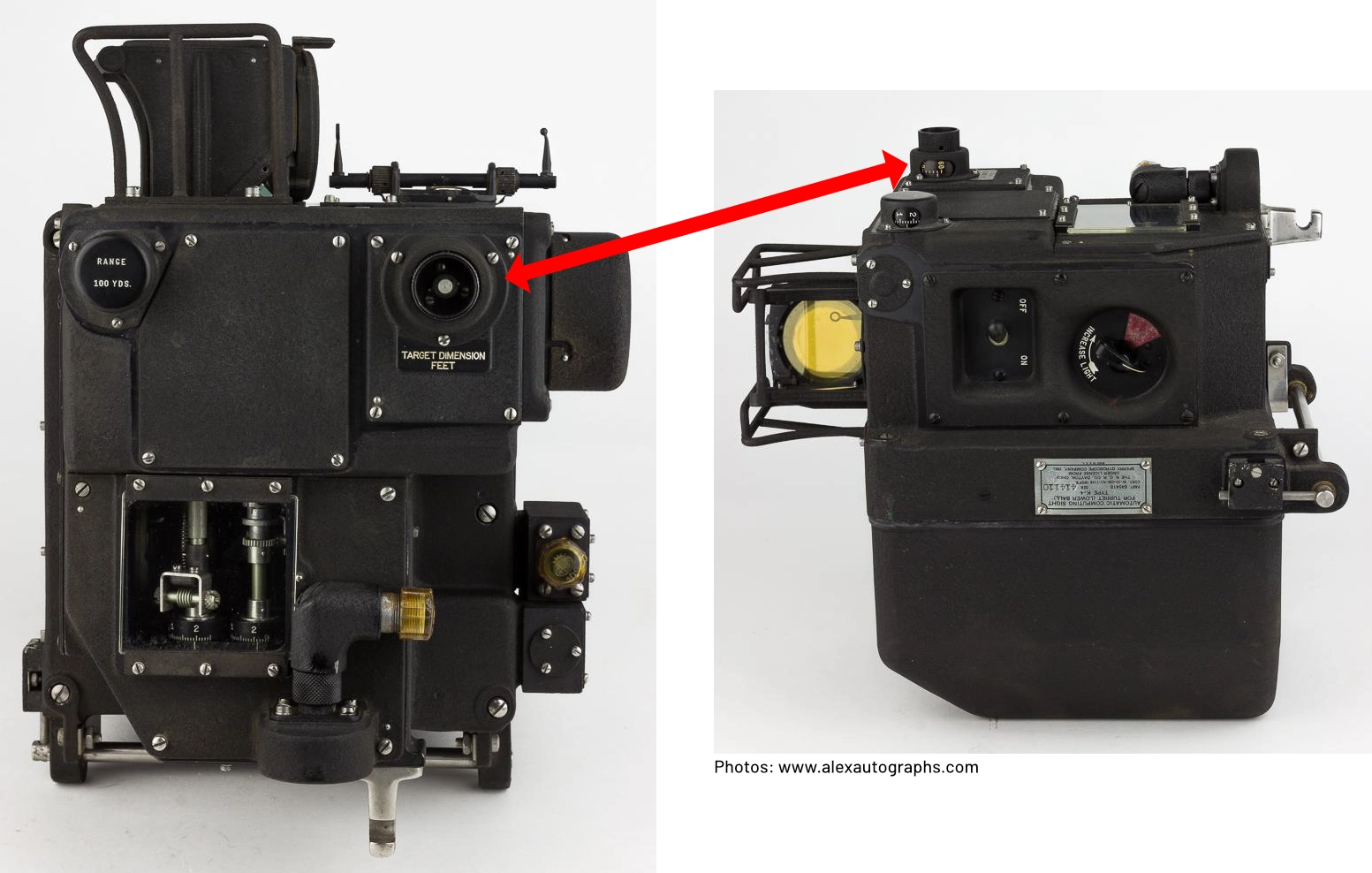Dieser Drehknopf wurde im K-4 Visier-Modul im Kugelturm installiert. Es wird vermutlich dafür verwendet um das eigentliche Visier, auf die Spannweite des Ziels einzustellen. Auf dem K-4 Visier-Modul findet man die Beschriftung "Target Dimension Feed" unter dem Drehknopf. |