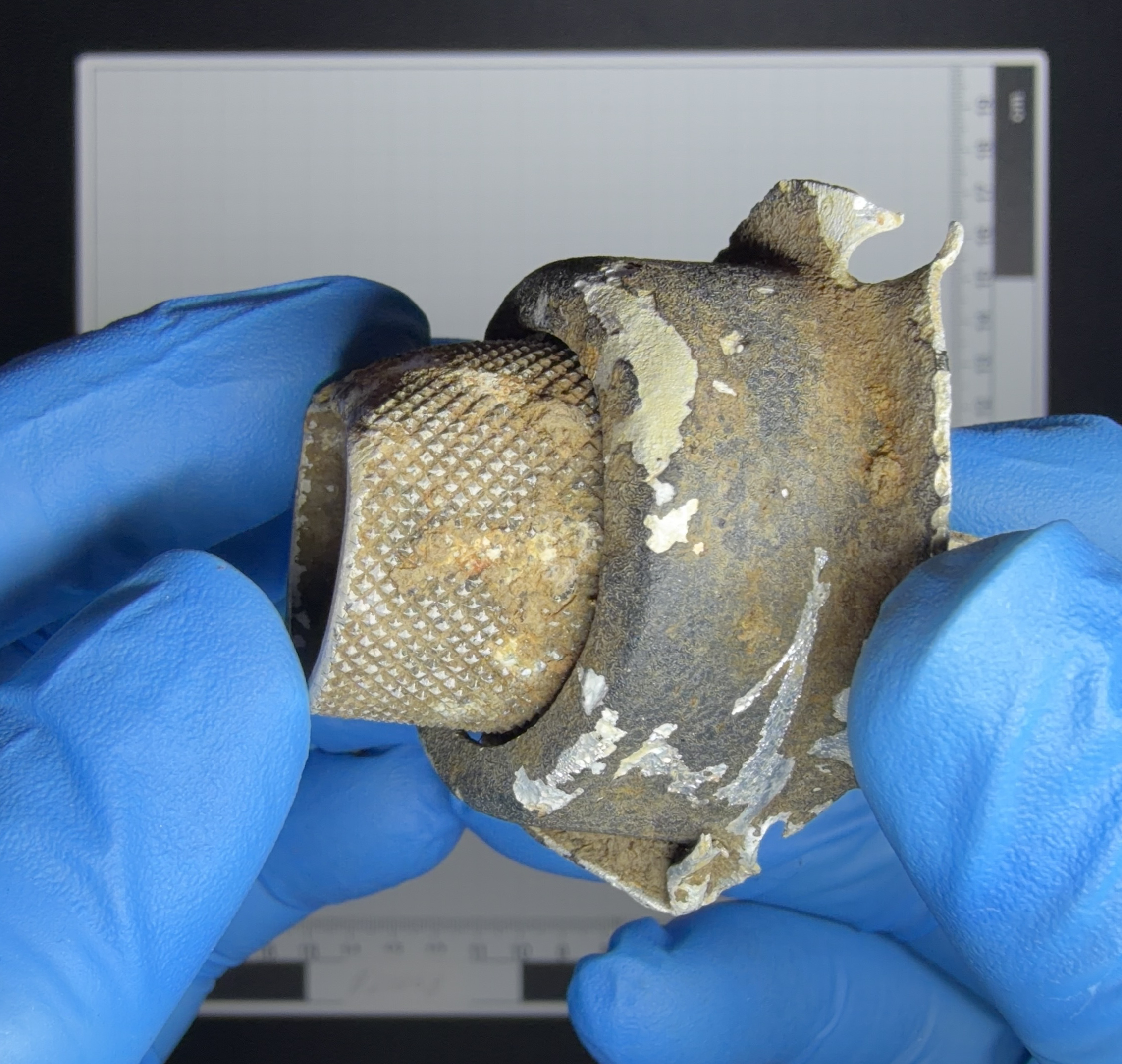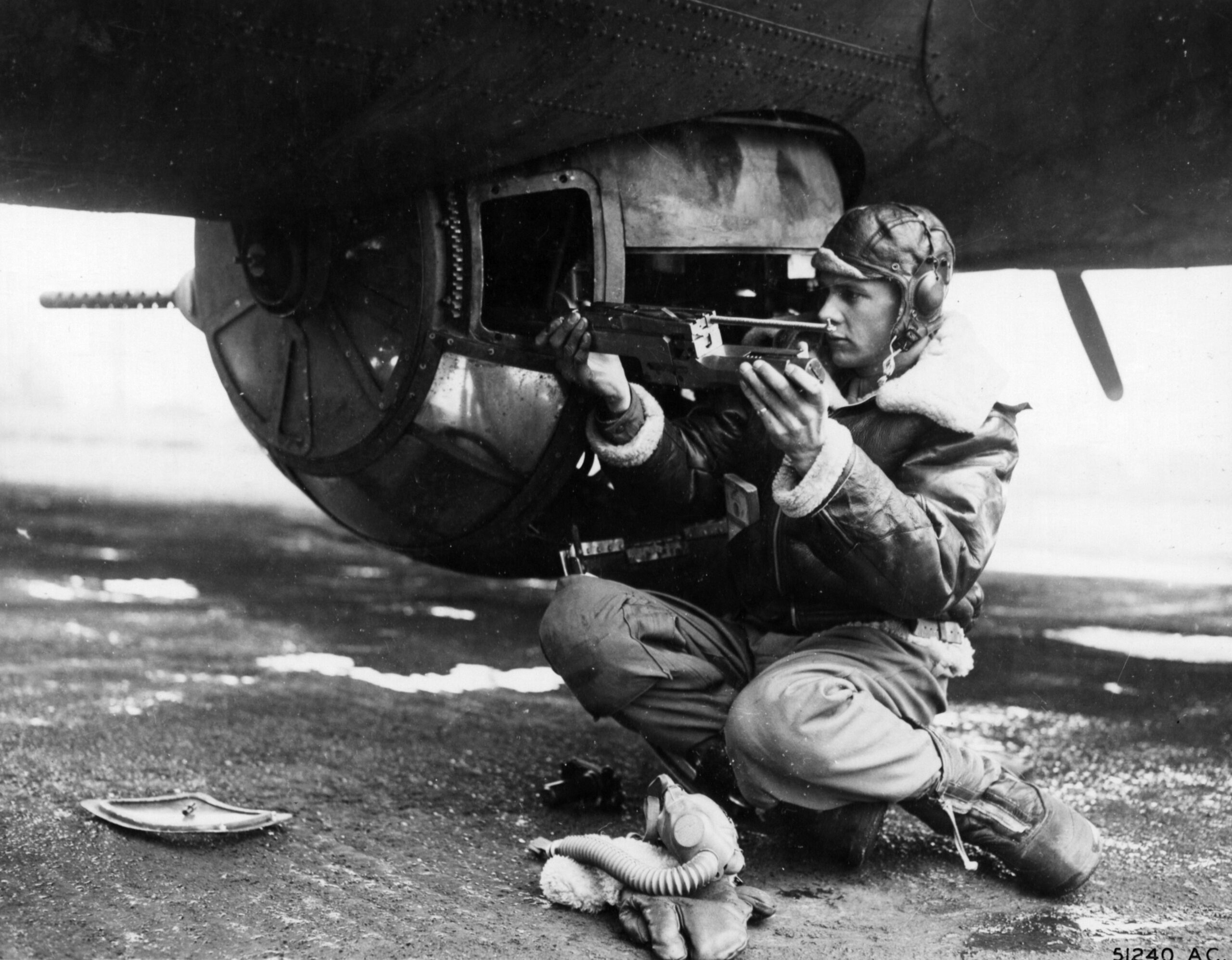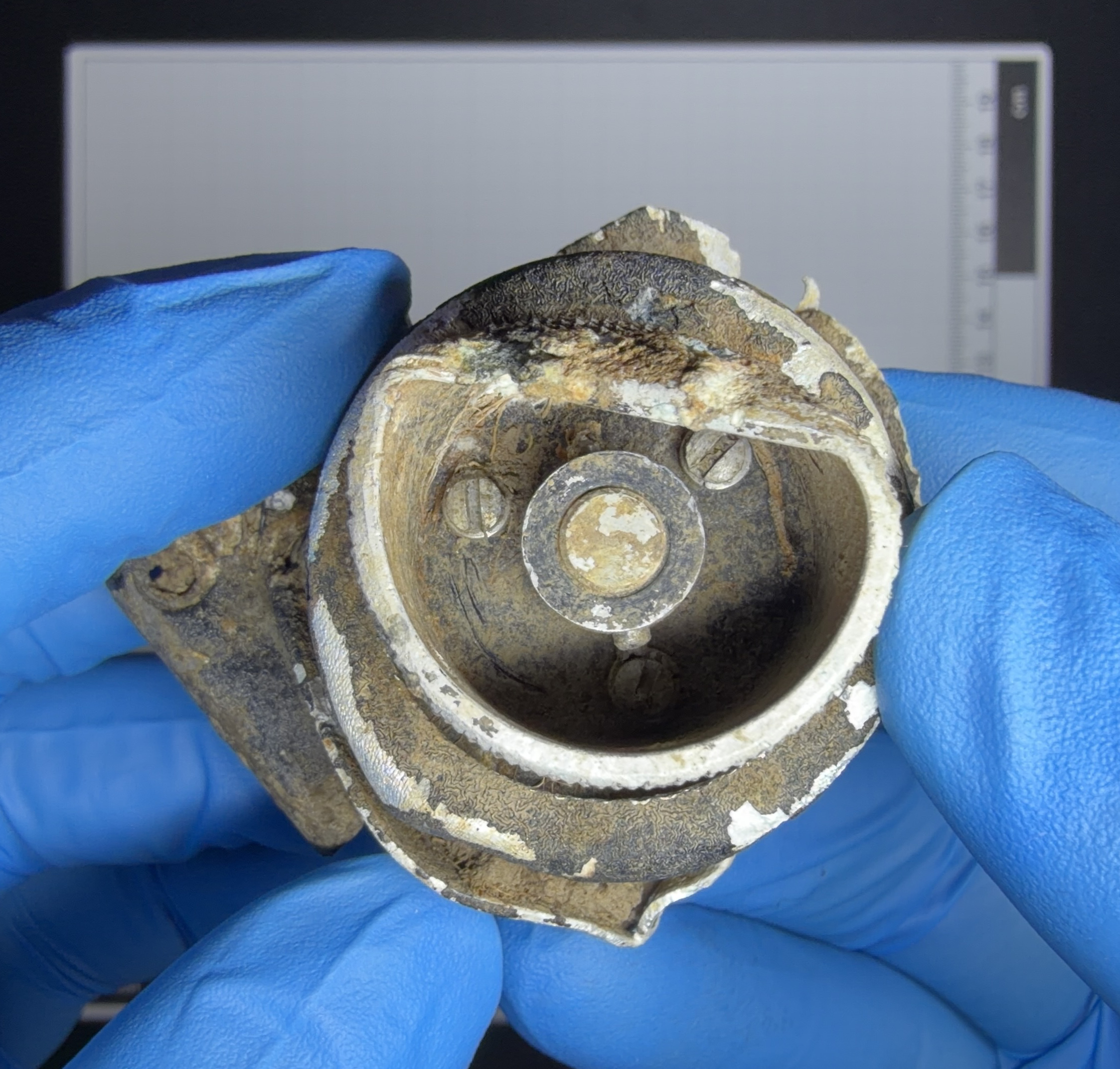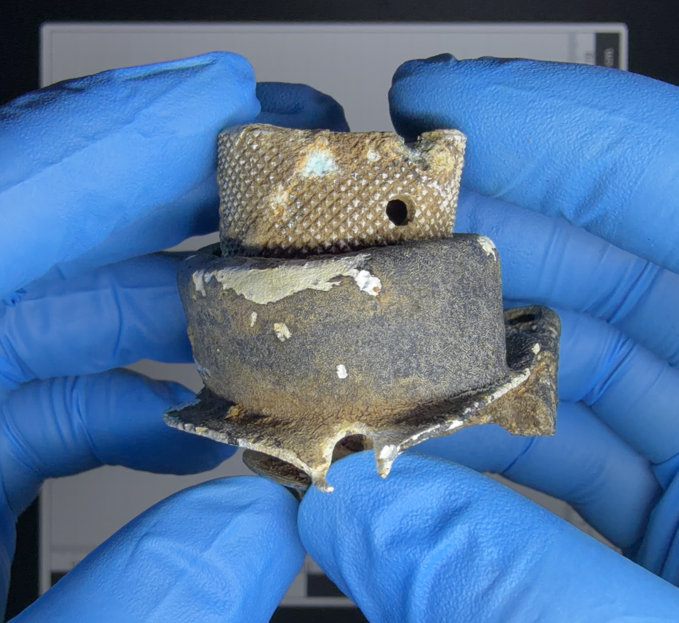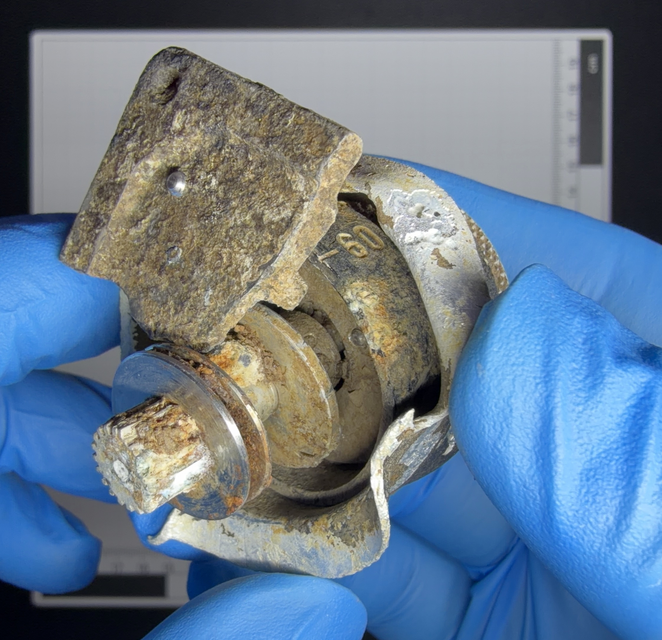 Dieser Drehknopf wurde im K-4 Visier-Modul im Kugelturm installiert. Es wird vermutlich dafür verwendet um das eigentliche Visier, auf die Spannweite des Ziels einzustellen. Auf dem K-4 Visier-Modul findet man die Beschriftung "Target Dimension Feed" unter dem Drehknopf. |